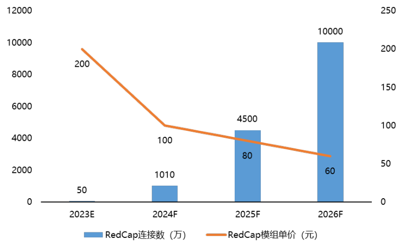 我们预计,RedCap将于2024年迎来爆发式增长,实现连接数超千万,模组单价将伴随连接数爆发而快速走低,价格有望在2024年底前降至100元左右;最早有望于2026年即实现连接数过亿,2026年底前,模组单价有望低至60元/片。