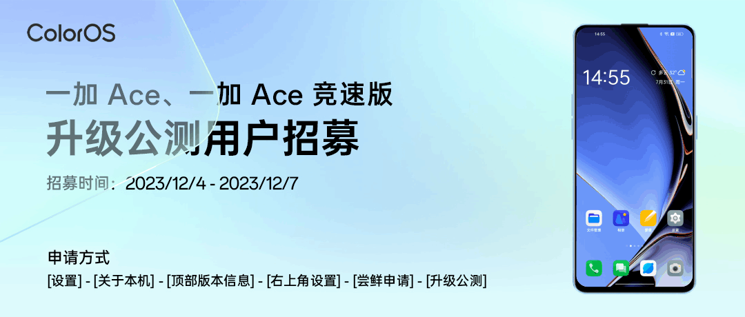 IT之家 12 月 4 日消息,一加 Ace /一加 Ace 竞速版开启 ColorOS 14.0 × Android 14 第二波升级公测招募,招募时间 12 月 4 日-7 日。