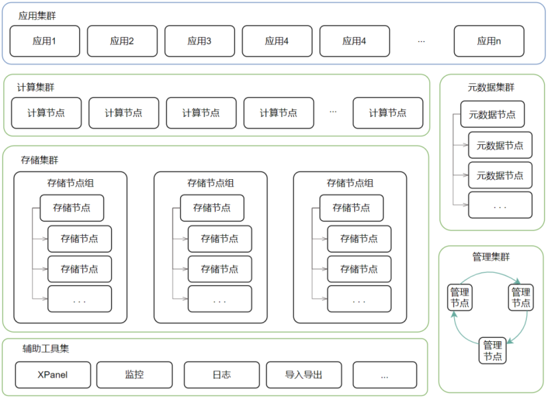 - 辅助工具集,在集群外还有一组生态工具,完成包括图形化管控、监控、日志、导入导出等工作。