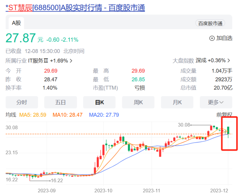 二级市场方面,12月7日、12月8日,*ST慧辰股价连续下跌。12月8日早盘,该公司股价一度下跌超5%,截至当日收盘,其股价报27.87元/股,下跌2.11%,最新市值为20.70亿元。