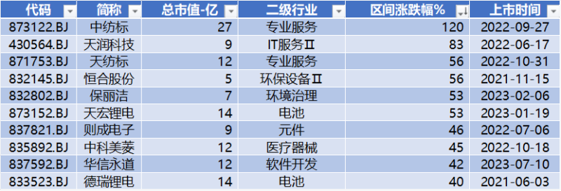 上表是本周涨幅榜前十公司,排名前十的公司分别是:坤博精工、凯华材料、志晟信息、华阳变速、铁大科技、大唐药业、星辰科技、华密新材、峆一药业、三维股份。