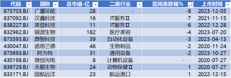 上表是本周北交所涨跌幅榜升序排列,排名前十的公司分别是:广厦环能、汉鑫科技、美登科技、锦波生物、鼎智科技、诺思兰德、阿为特、微创光电、永顺生物、国航远洋。