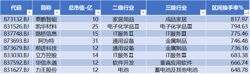 上表是本周北交所换手率前10名的公司,分别为:泰鹏智能、凯华材料、路桥信息、阿为特、前进科技、立方控股、华信永道、力王股份。