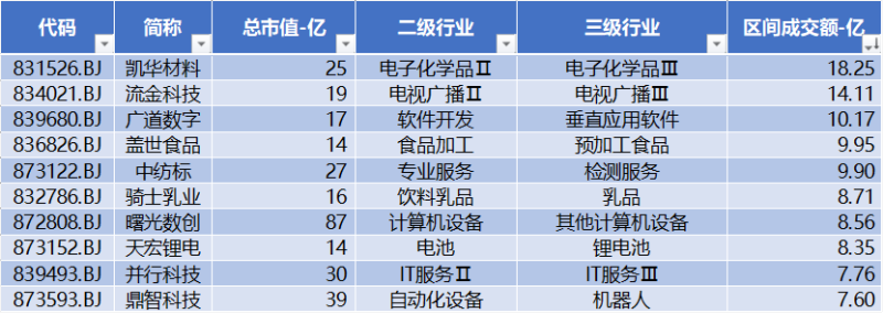 上表是本周北交所成交额前10名的公司,分别为:凯华材料、流金科技、广道数字、盖世食品、中纺标、骑士乳业、曙光数创、天宏锂电、并行科技、鼎智科技。