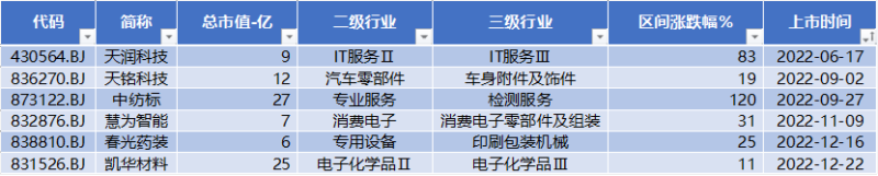 (12.04-12.08)本周北证50涨幅8.22%继续领先于A股各主要宽基指数。本周广厦环能IPO上市,市值近30亿。6家公司股价创出历史新高:天润科技、天铭科技、中纺标、慧为智能、春光药装、凯华材料。此外,北京云星宇交通上会并获通过。