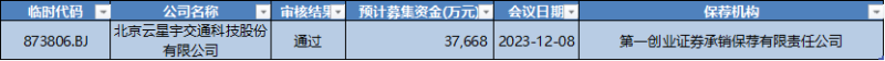 经wind数据查询,本周1家北交所公司上会并通过:北京云星宇交通科技。