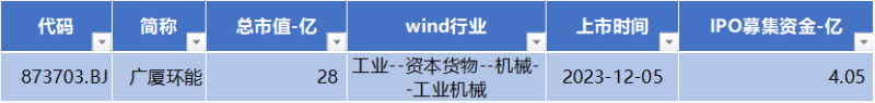 经wind数据查询,本周有一家北交所公司IPO上市:广厦环能(873703)。