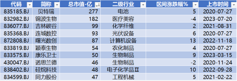 上图是本周北证50前十大权重公司市场表现,只有锦波生物与诺思兰德两家公司收益率为负,此外曙光数创涨幅13%排权重公司第一。