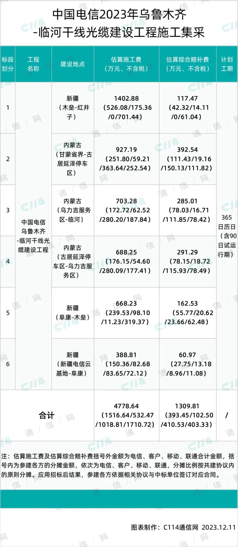 值得注意的是,本工程由中国电信、客户、中国移动和中国联通四方共建。本次招标内容为中国电信2023年乌鲁木齐-临河干线光缆建设工程施工项目,共划分6个标段,施工费(含综合赔补费)估算金额为6088.45万元人民币(不含税),其中,中国电信初设批复投资7046.50万元人民币,施工费(含综合赔补费)估算金额为1910.09万元人民币(不含税)。本项目涉及的安全生产费及规费不纳入本次招标范围,按照相关规定进行计列和支付。