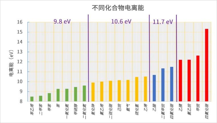 大部分气体都有其特定的电离能(IP),以电子伏特(eV)为计量单位,由UV灯发出的能量也以eV为单位。如果待测气体的IP低于灯的输出能量,那么这种气体就可以被离子化。电离能决定了该气体是否能被PID传感器检测到。