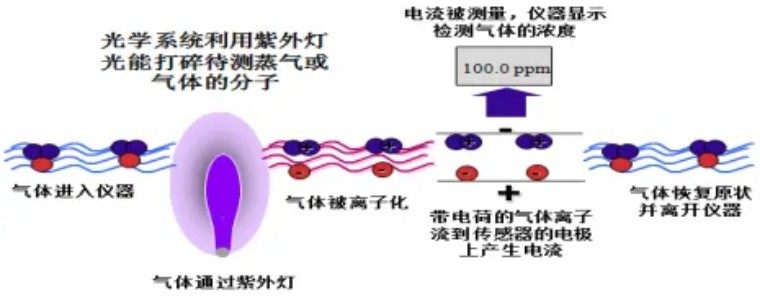 这种光离子化作用可以用来检测气体。传感器内的光源发射出一定波长的紫外光,这种紫外光具有足够的能量使气体分子或原子中的电子从基态跃迁到激发态,当电子返回基态时,它们释放的光子能量被传感器内的光电探测器检测到,从而形成电信号。气体浓度越高,被电离的气体分子或原子越多,也就产生了更多的光子,导致更强的电信号,所以电信号的大小与气体浓度紧密相关。
