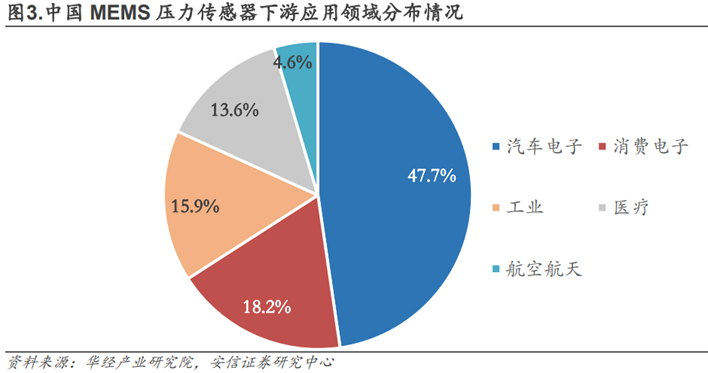 汽车电子、消费电子、工业制造为力传感器的主要下游应用。以MEMS压力传感器为例,汽车电子是第一大下游应用领域,约占我国总市场规模的47.7%,其次,MEMS压力传感器在消费电子、工业制造、医疗、航空航天领域也有着广泛应用,2020年分别占总市场规模的18.2%、15.9%、13.6%、4.6%。