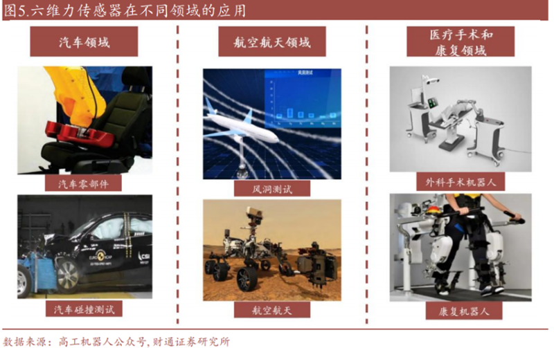 六维力测量技术属于平台型技术,根据应用场景的环境、载荷、安装、通讯、算力、动力学特性等需求不同,在不同的应用领域,六维力传感器的产品形态和技术特点也有较大区别。目前,六维力传感器主要应用于汽车行业的碰撞测试、轮毂、座椅等零部件测试以及航空航天、生物力学、医疗领域、科研实验、机器人与自动化等领域。