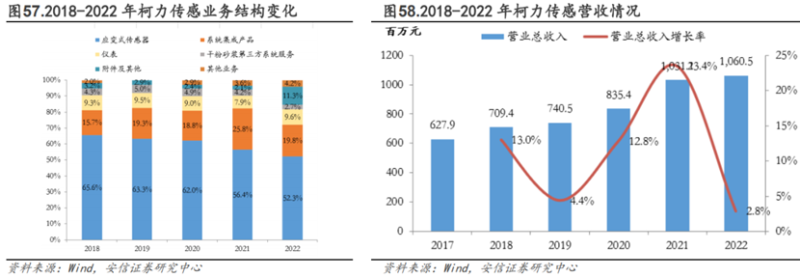 公司应变式传感器业务营收占比较高,营收稳步增长。2017-2022年,公司应变式传感器业务营收占比分别为65.6%/63.3%/62.0%/56.4%/52.3%,占比情况呈下降趋势,但总体保持高位,为公司营收的主要来源。近年来,系统集成产品、仪表、干粉砂浆第三方服务等业务收入占比总体较为稳定。近年来,公司营业收入持续稳步提升,2022年营业总收入达10.61亿元,同比增长2.8%。