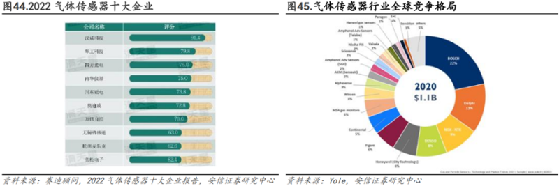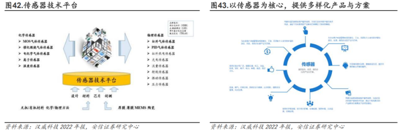 公司主营气体传感器产品,产销量位居国内前列。公司是国内领先、国际知名的气体传感器制造商,作为国内最早能够生产六大门类气体传感器的企业,现已打造出包含芯片设计、敏感材料、制造工艺、封测技术等全流程的传感器核心技术平台,掌握厚膜、薄膜、MEMS、陶瓷等核心工艺,能够生产的主流气体传感器产品上百种,涵盖催化燃烧类、厚膜印刷半导体类、电化学类、红外光学(含激光)类、MEMS工艺类等全球主流气体传感器技术,产销量位居国内前列。在赛迪顾问2022年气体传感器十大企业报告,依据业务规模、创新能力、应用领域三大指标及十余项二级指标评分后,汉威科技公司稳居第一名。据Yole统计数据,2020年汉威科技与子公司炜盛科技的气体传感器在全球市占率约为4%,与此同时,国际市场上其他中国气体传感器厂商的总市占率在1%以内。