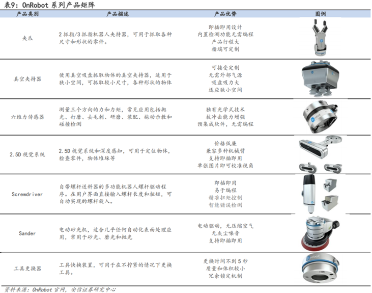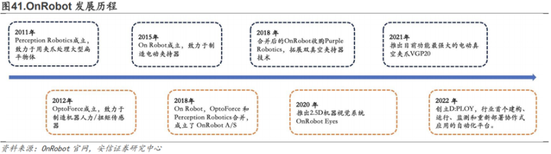丹麦OnRobot是电动夹爪行业的国际领先企业。OnRobot由四家机器人公司合并而来,分别是制造机器夹爪的PerceptionRobotics,制造机器人力/扭矩传感器的OptoForce,制造电动夹持器的OnRobot、制造双真空夹持器的PurpleRobotics。2020年,公司进军机器视觉领域,推出2.5D机器视觉系统OnRobotEyes。2022年,公司创立D:PLOY,行业内首个自动化平台,实现了机器人应用部署和运行过程的自动化,让用户可以在零编程和零模拟的基础上,将应用直接部署到制造车间。