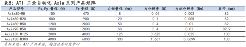 ATI的六维力传感器市场占有率,产销量都占据全球领先地位。2021年,ATI营业收入约7000万美元。现有六维力传感器产品包括:Axia系列,Nano系列,Mini系列,Gamma系列,Delta系列,Omega系列等,亦可依据客户需求定制,量程从32N-40000N,3Nm-6000Nm不等,可覆盖六维力传感器绝大多数应用场景。