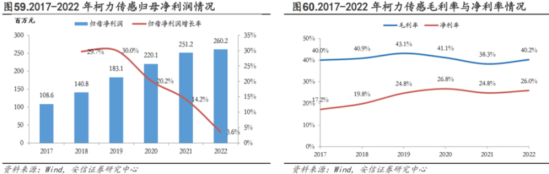 2017-2022年,柯力传感归母净利润持续增长,2022年净利润为2.60亿元,同比增长3.6%。近年来,其毛利率与净利率较为稳定,始终维持在较高水平。其中在2022年,毛利率与净利率水平分别为40.2%/26.0%。