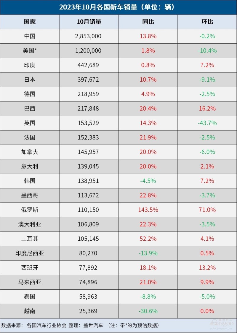 得益于强劲的出口量以及蓬勃发展的国内市场,中国新车销量同比增长13.8%至285.3万辆,不仅再创历史同期新高,而且超过了美国(约120万辆)和欧洲市场(约104万辆)的销量之和。虽然美国车市的增长受到了美国汽车工人联合会(UAW)罢工的冲击,但全球其他主要车市都实现了两位数的增长,尽管部分得益于去年销量比较基数较低。
