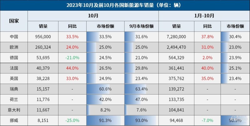 但总体来看,德国纯电动汽车市场的发展轨迹较为良好。德国10月纯电动汽车销量同比增长4.3%至37,334辆,但2023年前10月纯电动汽车累计销量为424,623辆,同比大涨37.7%。