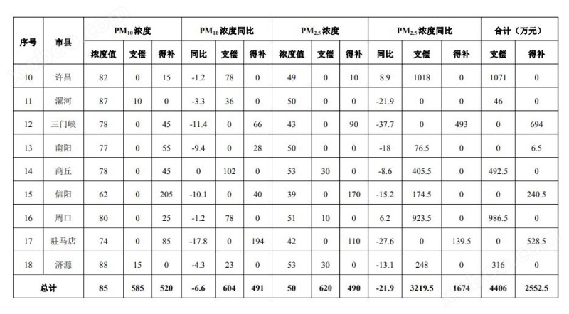按照有关文件规定,近日河南省生态环境厅公布各省辖市(示范区)2023年11月城市环境空气质量生态补偿情况:2023年11月,各省辖市共支偿城市环境空气质量生态补偿金4406万元,得补2552.5万元。