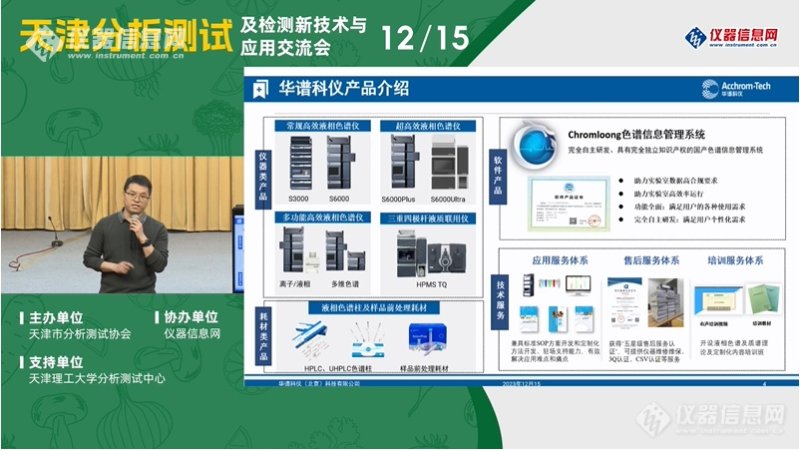 李博介绍了华谱科仪的液相产品及相关耗材、软件和技术服务等情况;并针对药品、食品、环境和化工等领域的整体解决方案进行了详细案例分享,特别介绍了多维色谱检测增加峰容量、在线样品前处理、提高样品通量的3种典型应用。