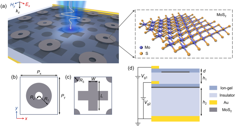 针对上述问题,研究团队利用二维材料二硫化钼设计超构表面,提出了一种三波段独立可调谐的中红外吸波器。利用图案化二硫化钼的局域表面等离激元共振效应,成功在7.9、12和17 μm处实现了99%以上的电磁波吸收,同时在3–5 μm和8–11 μm的红外大气窗口具有较低的红外发射率。此外,通过调节二硫化钼的载流子浓度,可以对三个吸收峰进行动态独立调控,并利用多重反射干涉理论模型成功解释了其内在物理机制,理论与实验结果符合得很好。该项研究成果解决了目前传统吸波材料吸收率低、不可调以及缺少理论指导的问题,在红外隐身、红外探测、热辐射测量等方面具有潜在的应用前景。