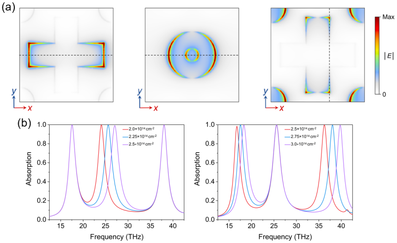 图2 (a) 图案化二硫化钼中表面等离激元共振模式的电场分布图;(b) 不同二硫化钼载流子浓度对应的电磁波吸收谱。