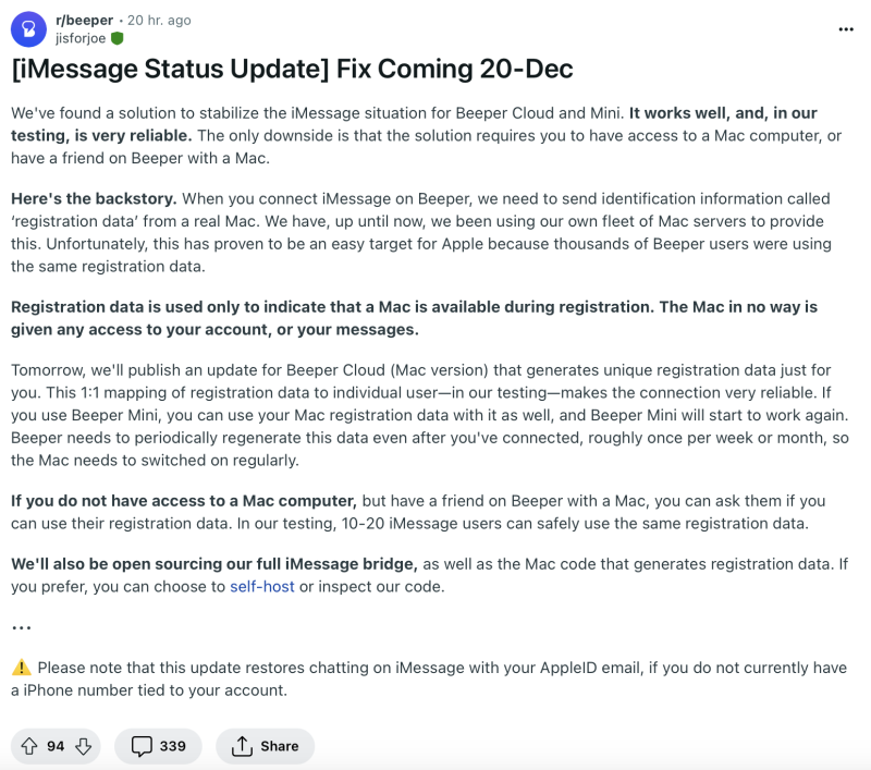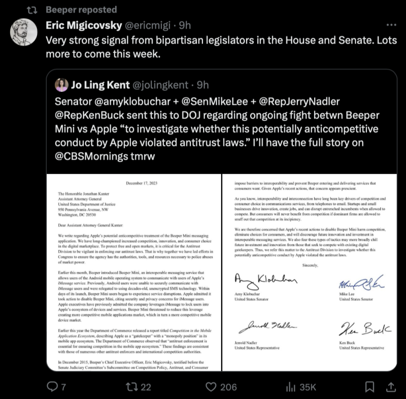 不过 Beeper 的 CEO Eric Migicovsky 此前还转发了一则贴文,声称苹果公司将在法律层面要求 Beeper Mini 应用停止服务。