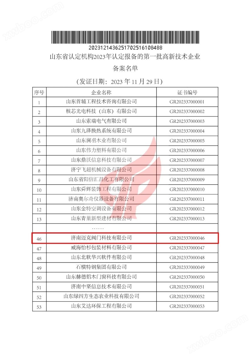 2023年12月18日,全国高新技术企业认定管理工作领导小组办公室发布《对山东省认定机构2023年认定报备的第一批高新技术企业进行备案的公告》,公示迈克阀门科技有限公司成功通过“高新技术企业”复核,进入国家高新技术企业备案名单。