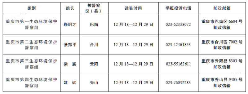 重庆市第二轮第一批生态环境保护例行督察进驻一览表