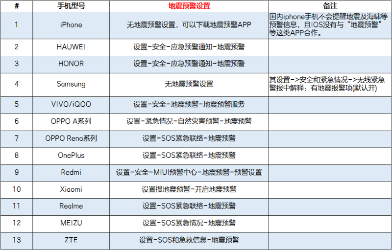 探索了各个品牌手机地震预警系统打开的方式,如下表。打开方式大同小异,多数手机可以在设置中搜索“地震预警”打开。