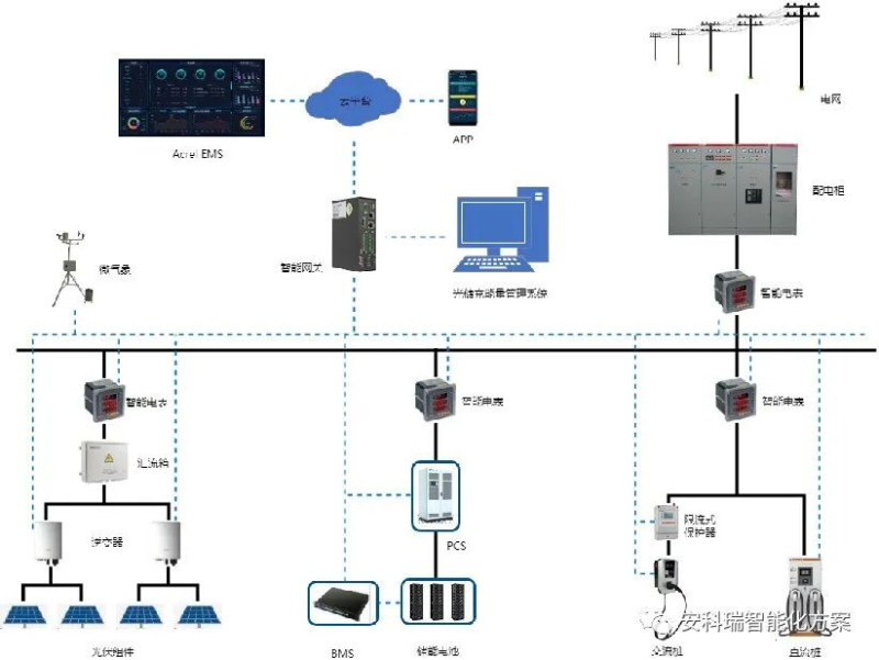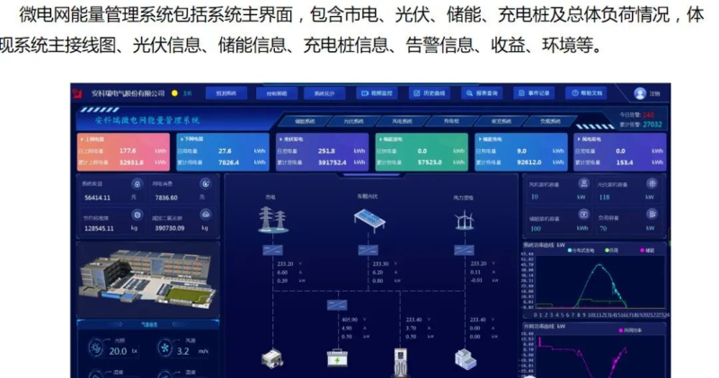 子系统监控可显示市电、光伏、风电、储能、充电桩系统的运行状态、实时数据、系统组成等;