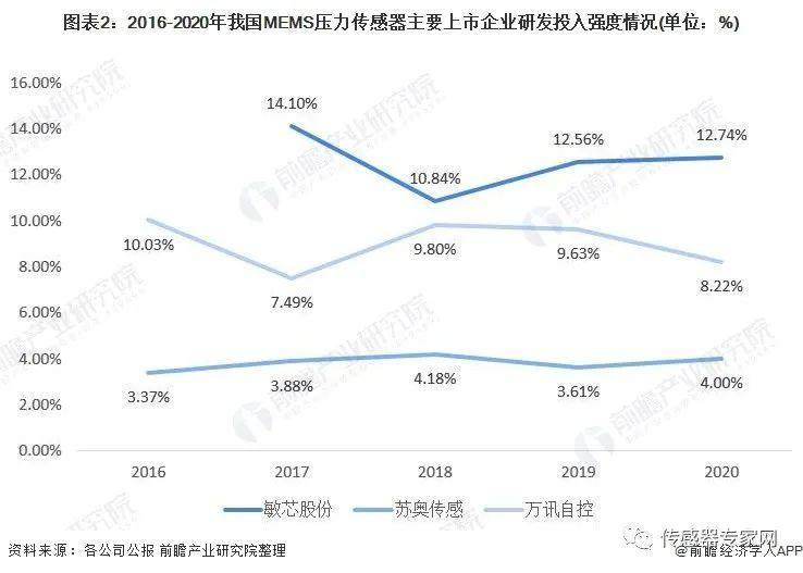 从我国MEMS压力传感器主要上市企业的研发投入强度来看,2016-2020年,我国主要企业的研发投入强度较大,尤其是敏芯股份(688286),研发投入强度基本保持在10%以上。