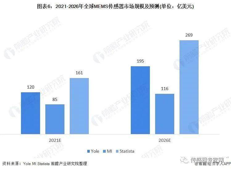 Yole Développement给出预计值195亿美元,2020-2026年CAGR为10.17%,Mordor Intelligence预计2026年MEMS传感器市场规模为116亿美元,CAGR为6.37%。