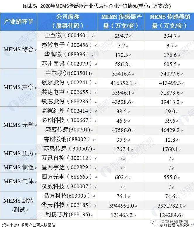 2、MEMS传感器产业代表性企业产销情况