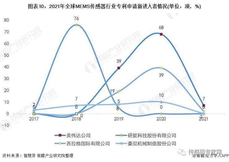 趋势方面,2010-2017年,三星电子株式会社在MEMS传感器专利布局方面一直处于全球领先地位,2018年开始有所下滑,直至2020年被英伟达公司(68项)反超。