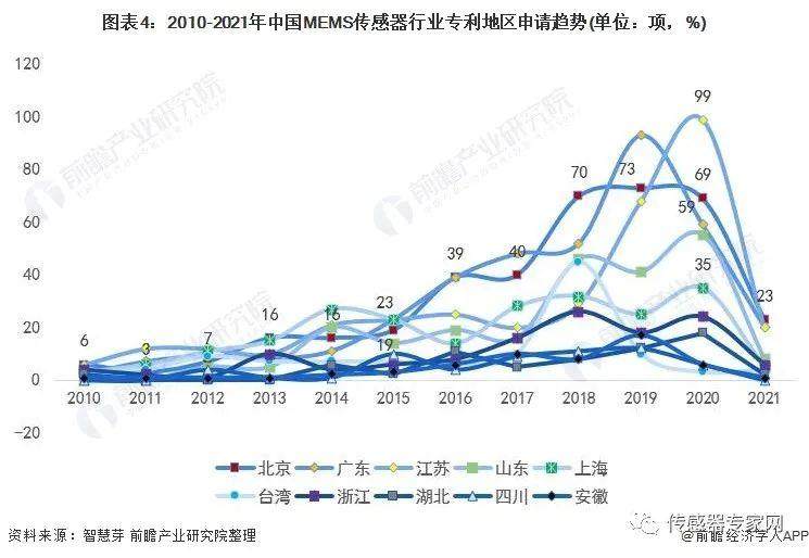 趋势方面,2010-2019年期间,广东和北京MEMS传感器专利申请量处于优势地位,2020年,江苏省超过北京和广东,成为当年MEMS传感器申请专利数量最多的省市,为99项;北京和广东的申请数量分别为69项和59项;山东紧随其后,为55项。