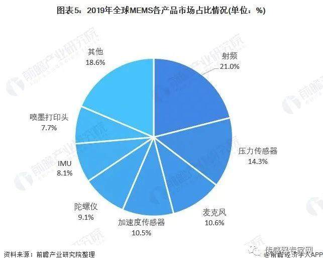 从全球产品结构来看,市场份额最大是射频(MEMS执行器),主要得益于在工业和消费品等领域的广泛应用,市场占比达到21%。