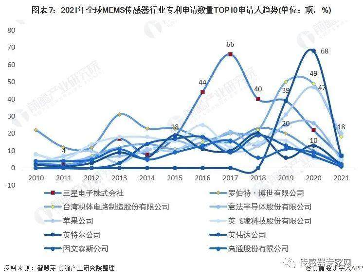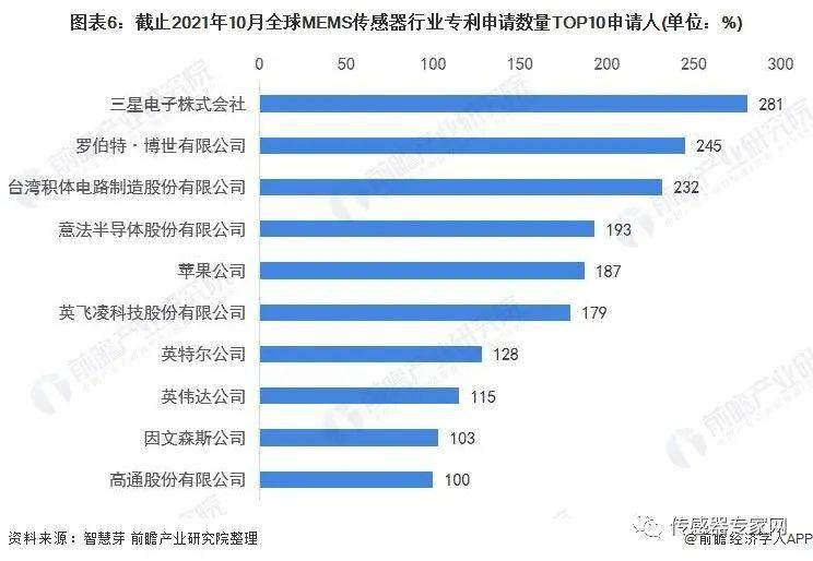 全球MEMS传感器行业专利申请数量TOP10申请人分别是三星电子株式会社、罗伯特·博世有限公司、台湾积体电路制造股份有限公司、意法半导体股份有限公司、苹果公司、英飞凌科技股份有限公司、英特尔公司、英伟达公司、因文森斯公司和高通股份有限公司。
