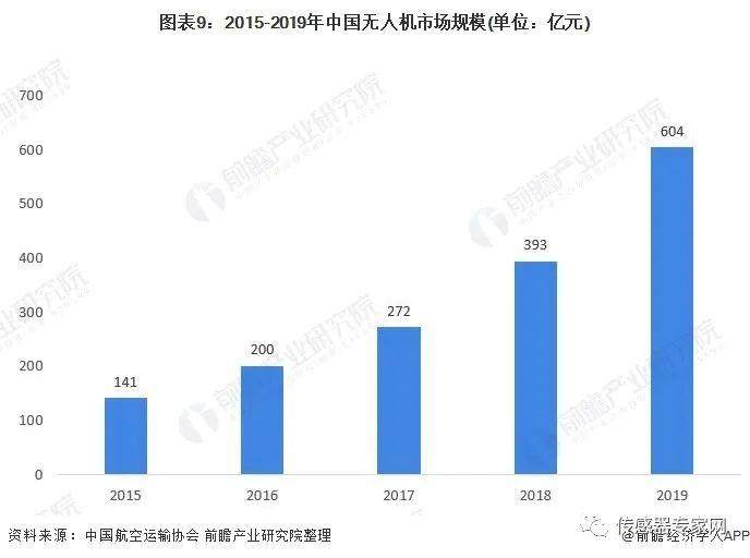 随着无人机技术的逐步成熟,近几年无人机应用逐渐从军用扩展到民用领域,在防灾、电力、森林、气象、喷洒农药、遥感遥测、电力巡线、地质勘探、海洋勘测等多方面有广泛的应用,并且已有货运航空公司开展无人机送货的实验运行。2015-2019年我国无人机市场规模不断扩大,2019达到604亿元。