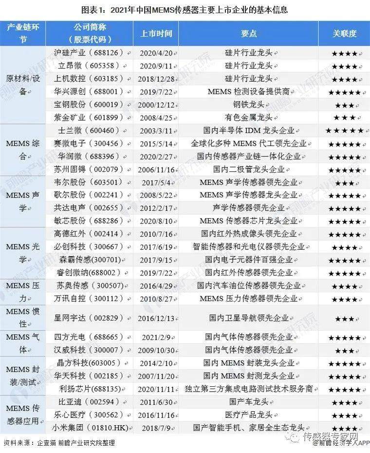近几年,我国涌现出像士兰微(600460)、敏芯股份(688286)等以IDM模式经营的企业,自主研发能力进一步提升。从我国MEMS传感器上市企业汇总来看,我国该行业已布局声学、光学、压力、惯性等细分领域。