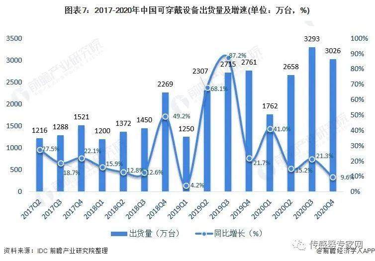 2017年以来中国的可穿戴设备出货量逐年增加,2020年第四季度可穿戴设备出货量为3026万台,同比增长9.6%。