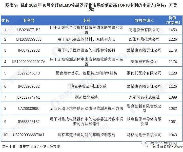 总的来看,全球价值较高的MEMS传感器专利主要集中在医疗领域。