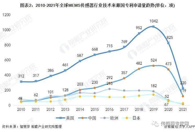从趋势上看,2010-2020年,美国MEMS传感器专利申请数量遥遥领先,2019年达到1042项,2020年有所下降,为825项。