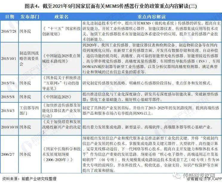 自2006年以来,国务院、国家发改委、工信部等多部门都陆续印发了支持、规范MEMS传感器行业的发展政策,内容涉及MEMS传感器发展技术路线、MEMS传感器发展目标、MEMS传感器的应用推广等方面: