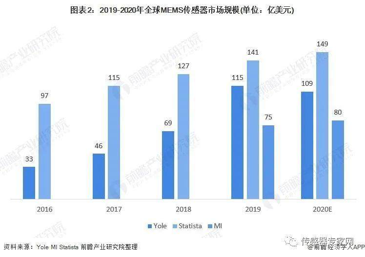 近年来,受益于汽车电子、消费电子、医疗电子、光通信、工业控制、仪表仪器等市场的高速成长,MEMS行业发展势头迅猛。2020年,由于统计范围不一致,国外权威机构对MEMS传感器市场规模测算跨度较大。