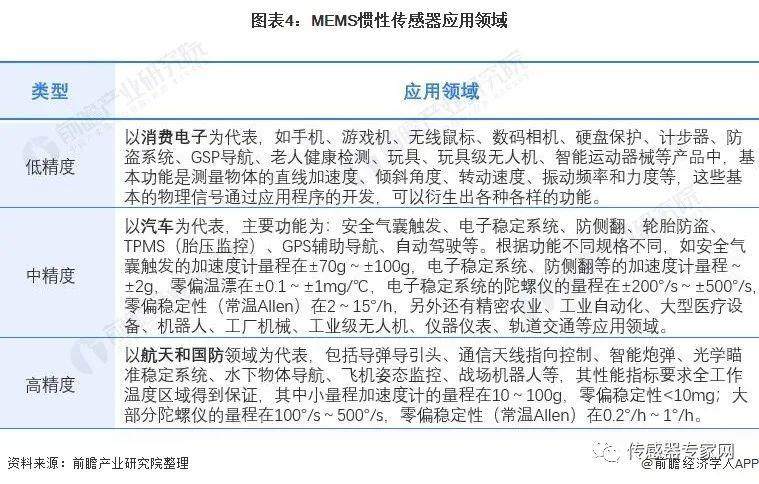 按MEMS惯性传感器的不同精度来看,低精度MEMS传感器主要应用于消费电子领域,中精度MEMS传感器主要应用于汽车行业,高精度MEMS惯性传感器主要应用于航天和国防领域。随着高精度MEMS惯性传感器的不断更新迭代,未来应用领域将更为广泛。