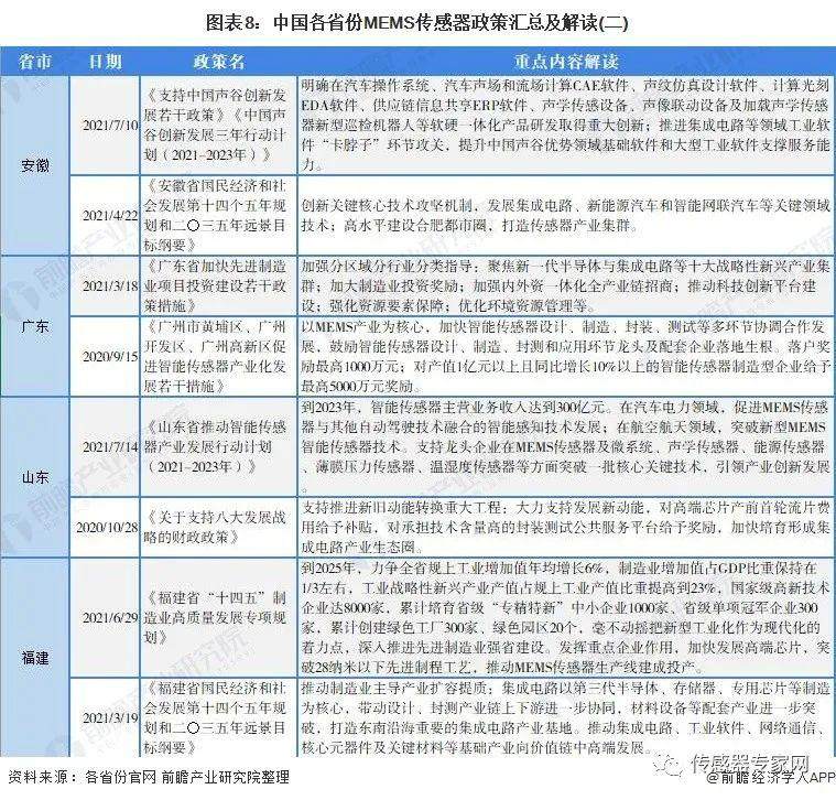 “十四五”期间,我国主要省份也提出了MEMS传感器行业的发展目标。山东省明确提出到到2023年,智能传感器主营业务收入达到300亿元,其他省市如浙江、福建、广东和海南均提出了MEMS传感器行业发展的目标或规划: