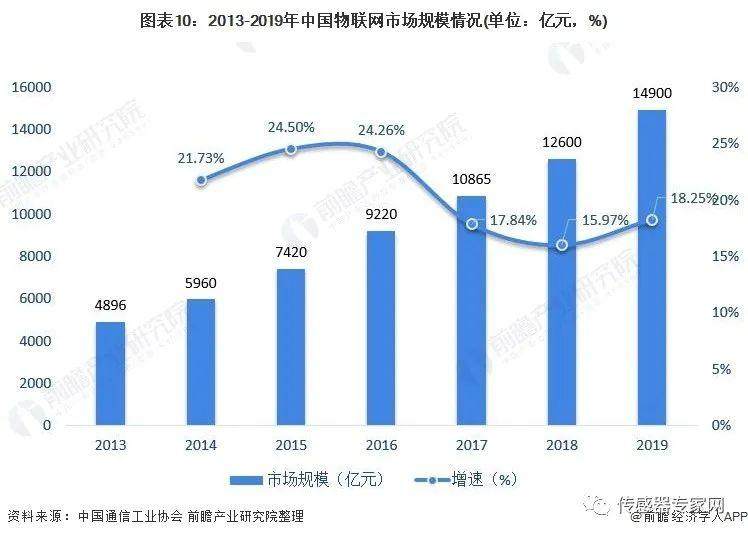 2013-2019年,我国物联网市场规模增速达到15%以上。2019年,我国物联网市场规模达到14900亿元,同比增长18.25%。未来,随着国家政策对物联网等新兴行业的倾斜,对应的,其衍生的MEMS声学传感器市场将迎来新一波高增长。